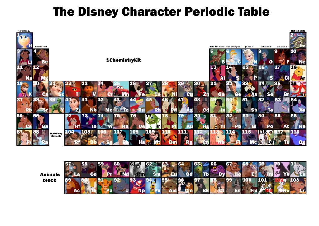 There are a whole host of classroom activities you could do with his idea: pick an element and decide what Disney character you’d choose; talk about how group periodicity works using examples; or even ask what character the class would pick for element 119, based on the rules. Sibrina Collins and LaVetta Appleby have done a similar exercise for schoolkids using vibranium, the element in Black Panther.